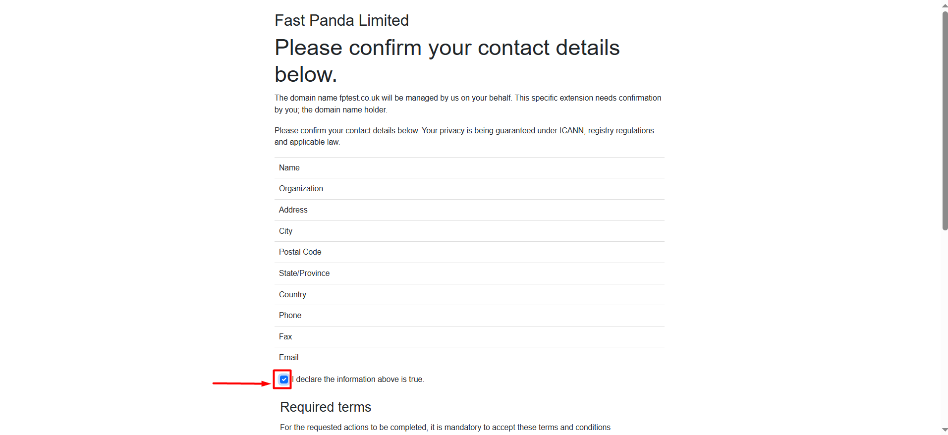 On the page that opens, you must check the boxes below to confirm domain ownership and declare the accuracy of the information. The required fields to be selected are as follows: