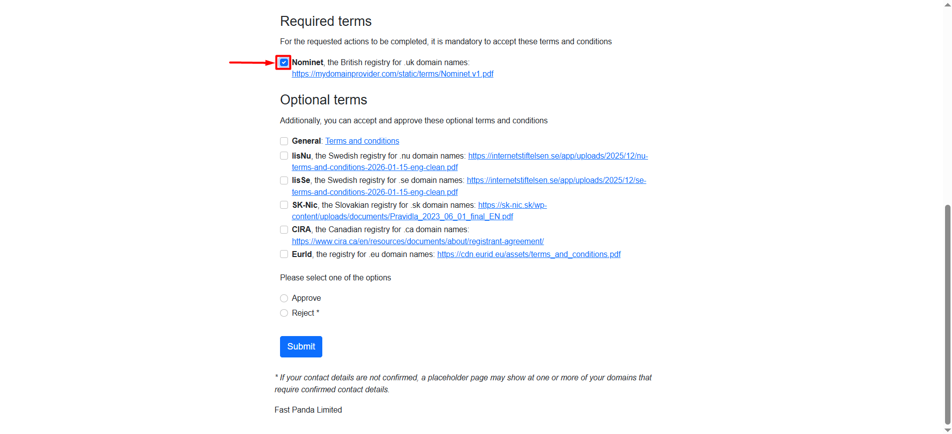 • For .co.uk domain names, acceptance of the rules of Nominet, the official registry of the United Kingdom.