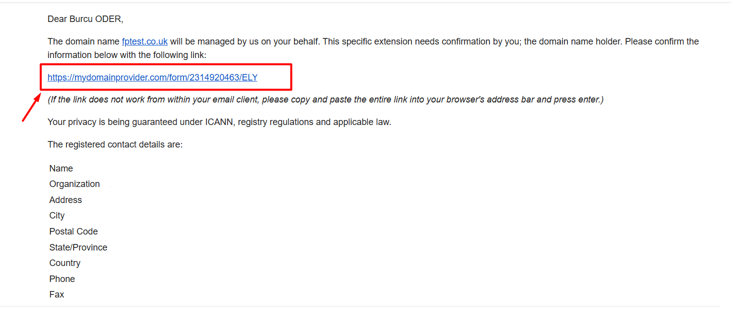When .co.uk domain names are purchased, verification of the domain owner’s contact information is mandatory. This verification process is automatically initiated as part of the domain registration procedure. After the domain name is purchased, a verification (confirmation) email is sent to the domain owner’s email address registered in the system. The contact information must be verified by using the link provided in this email. A sample email is shown below. To complete the domain owner verification process, click the verification link included in the email.