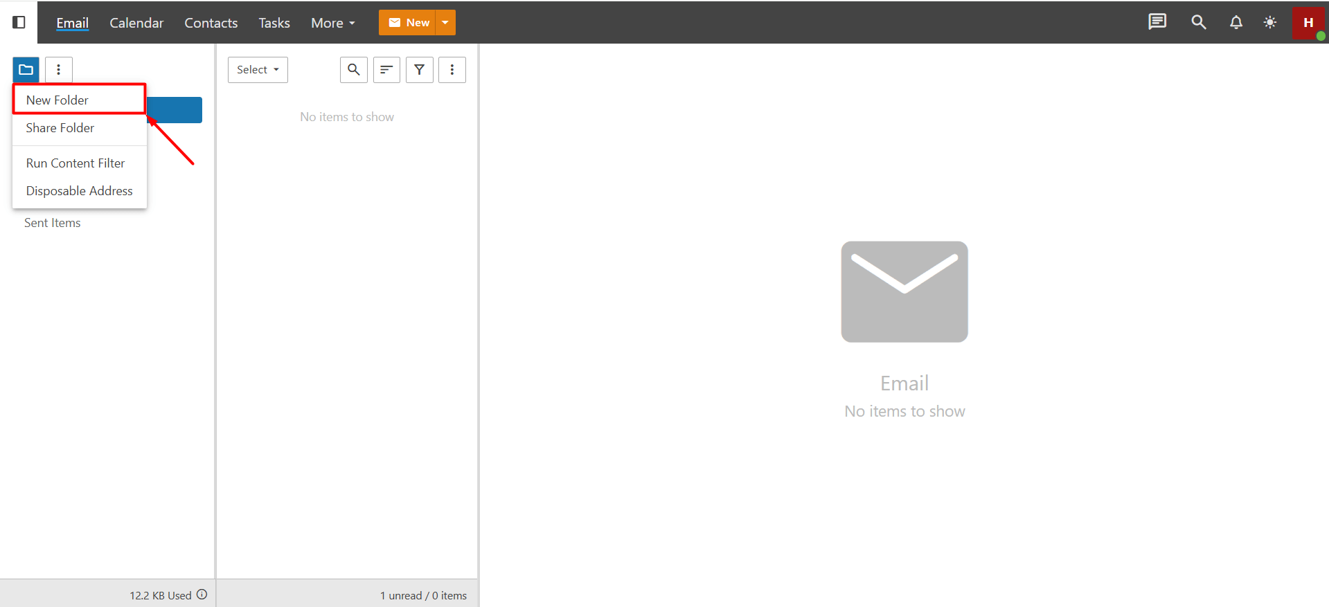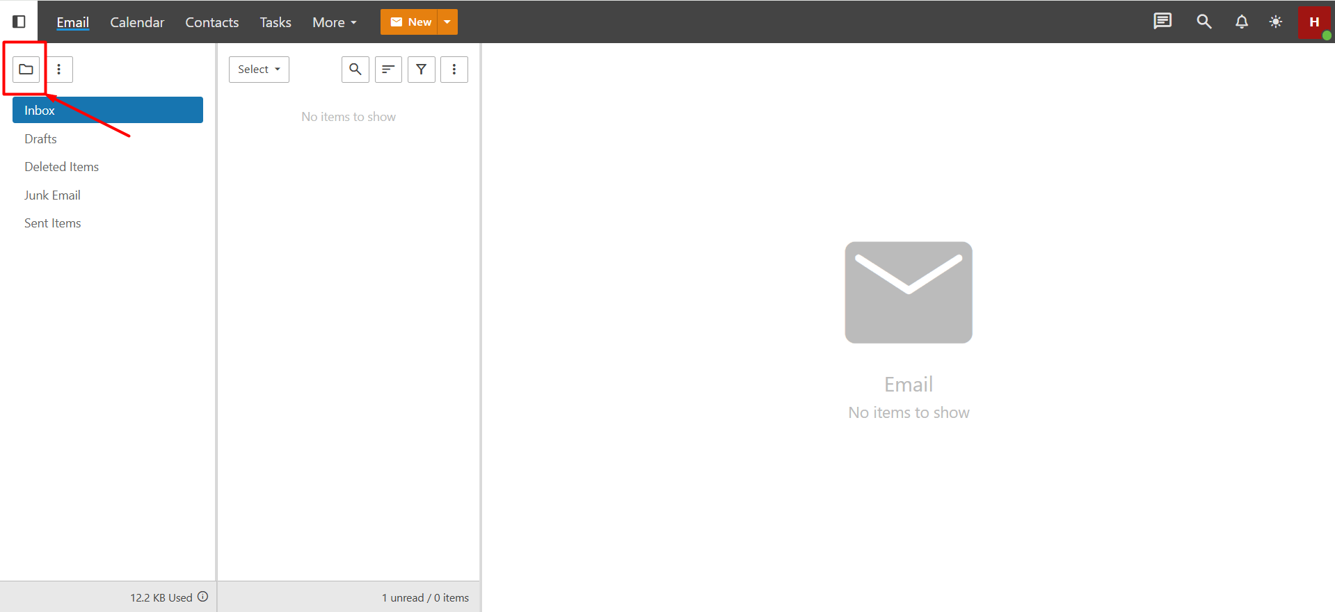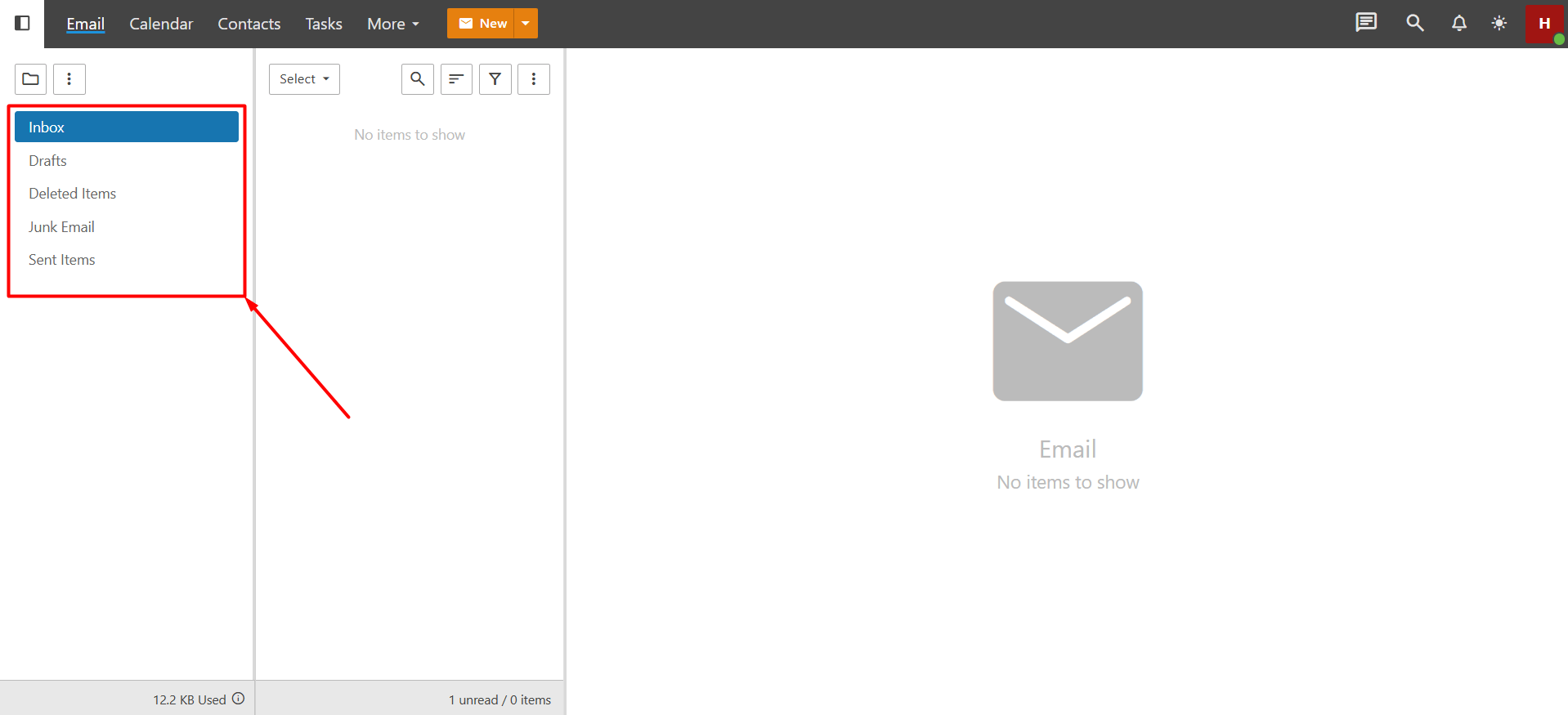 - Inbox: Unless you have set up a specific filter, all incoming emails are collected here. New emails received in your account are shown as unread. You can read, delete, or move incoming emails to another folder.